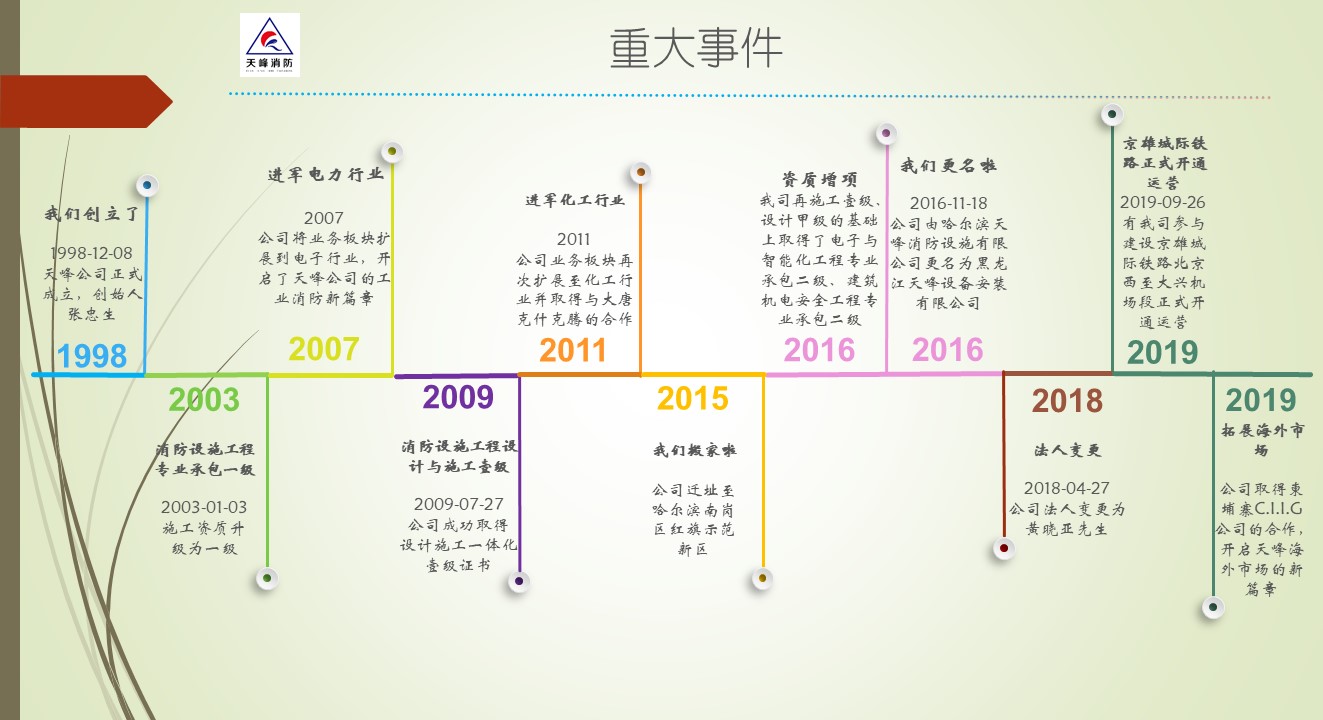 黑龍江天峰設(shè)備安裝有限公司(以下簡(jiǎn)稱(chēng):天峰消防)創(chuàng)立于1998年,主要承接能源化工、石化、電力、軌道交通、冶金、城市管廊等工業(yè)行業(yè)消防系統(tǒng)工程,可為客戶提供特殊消防系統(tǒng)的詳細(xì)設(shè)計(jì)、供貨、施工等集成服務(wù),天峰消防將依靠自身實(shí)力和信譽(yù)實(shí)現(xiàn)“立足龍江,布局全國(guó),走向海外”的目標(biāo)。